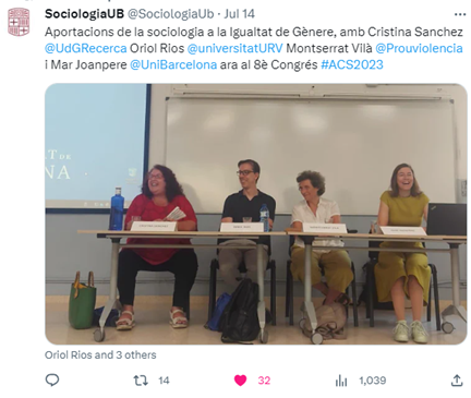 A més de participar en diferents comunicacions, destaquem avui la contribució de Mar Joanpere i Oriol Rios al panel "Aportacions de la sociologia a la igualtat de gènere".