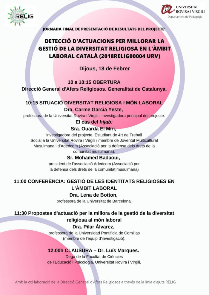 El dijous dia 18 de Febrer, de 10h a 12h en format virtual, tindrà lloc la jornada final del projecte que porta per títol: Detecció d'actuacions per millorar la gestió de la diversitat religiosa en l'àmbit laboral català, finançat per la Direcció General d'Afers Religiosos de la Generalitat de Catalunya.